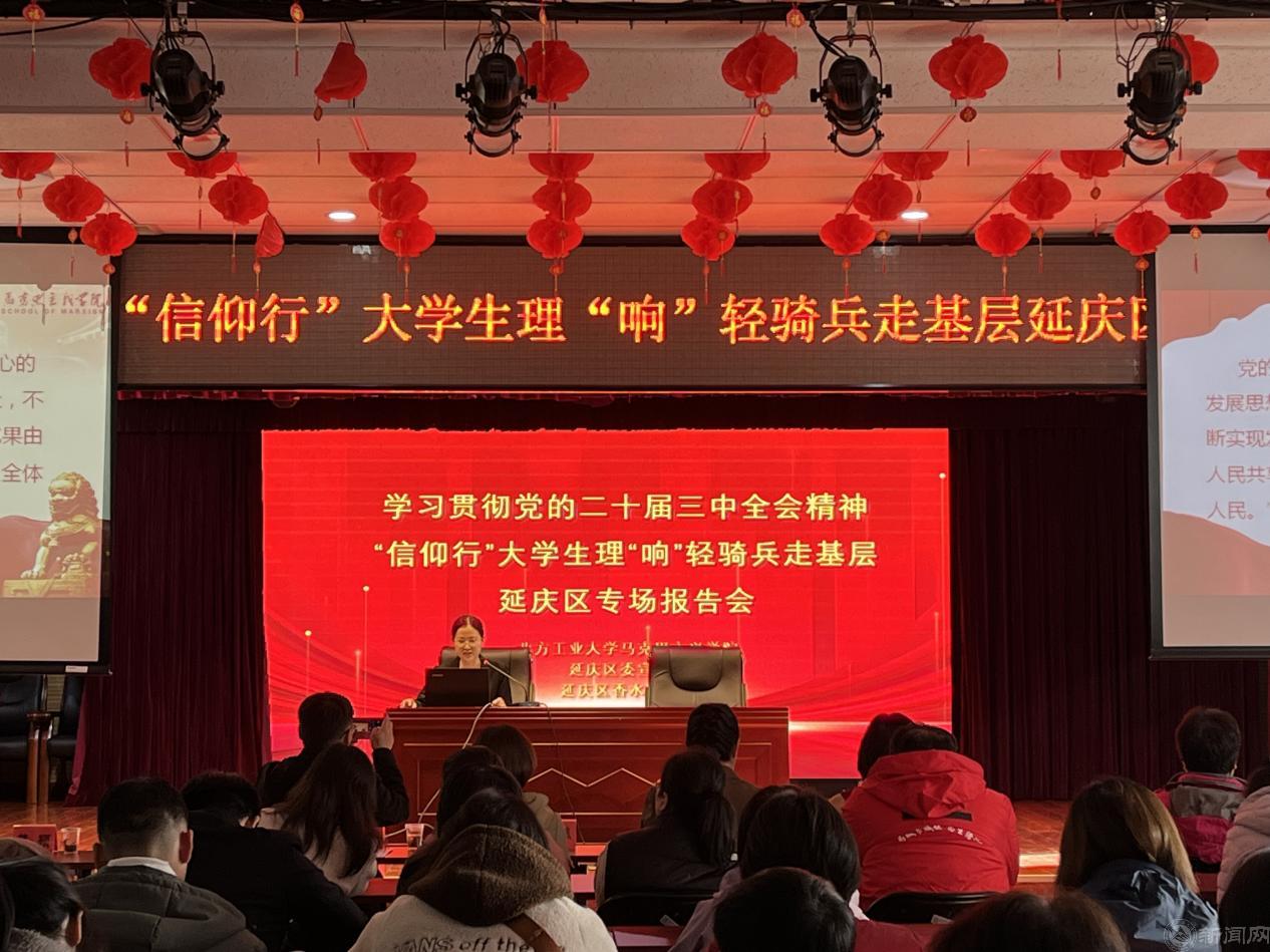 为进一步凝聚思想共识、筑牢理论根基,推动党的二十届三中全会精神紧贴实际、深入人心,10月24日,AWC万象城娱乐师生宣讲团一行赴延庆区,开展“信仰行”大学生理“响”轻骑兵走基层活动。师生们分别来到延庆镇、旧县镇和香水园街道,开展党的二十届三中全会精神专题宣讲。二百余名党员代表、群众代表参加报告会。宣讲活动受到当地党员群众的普遍好评。